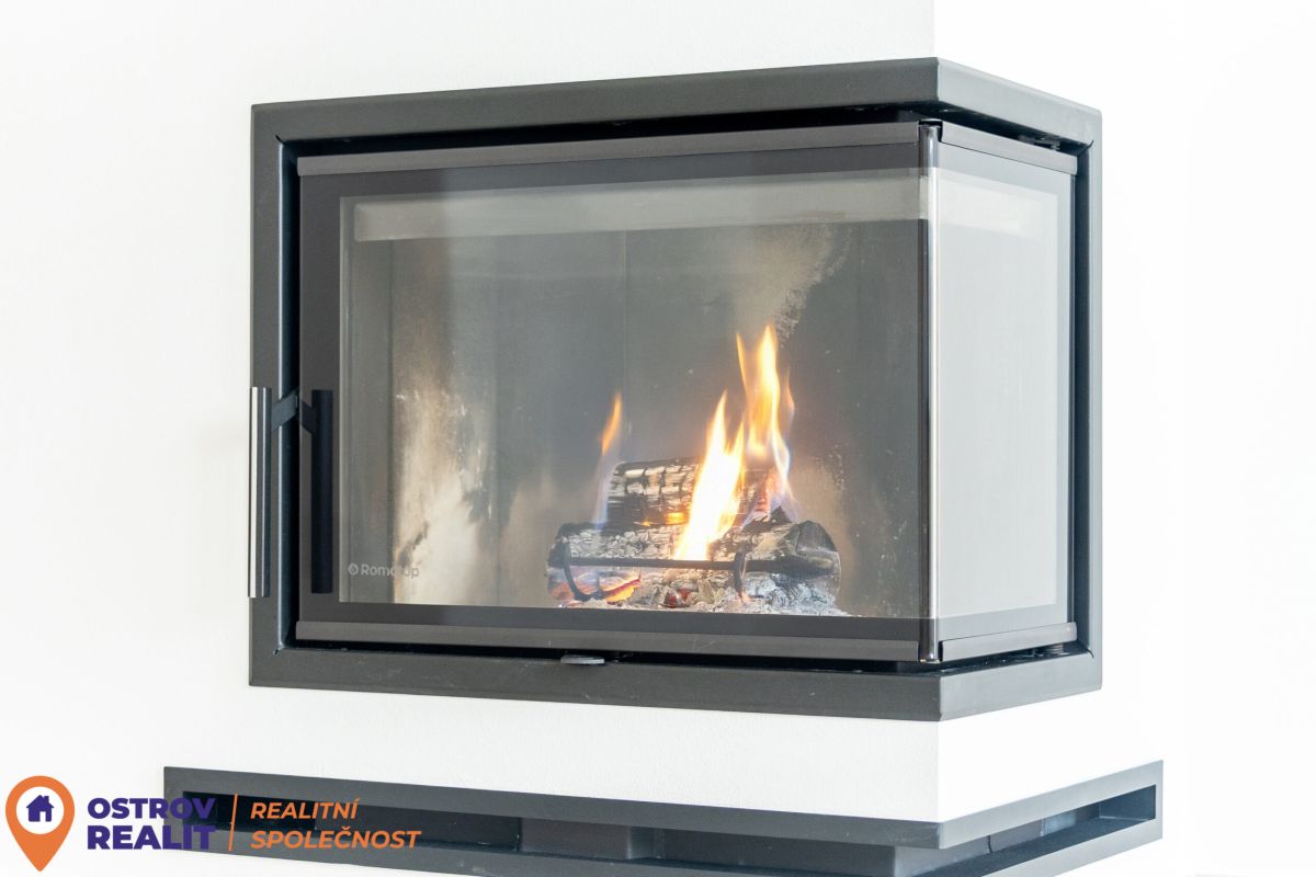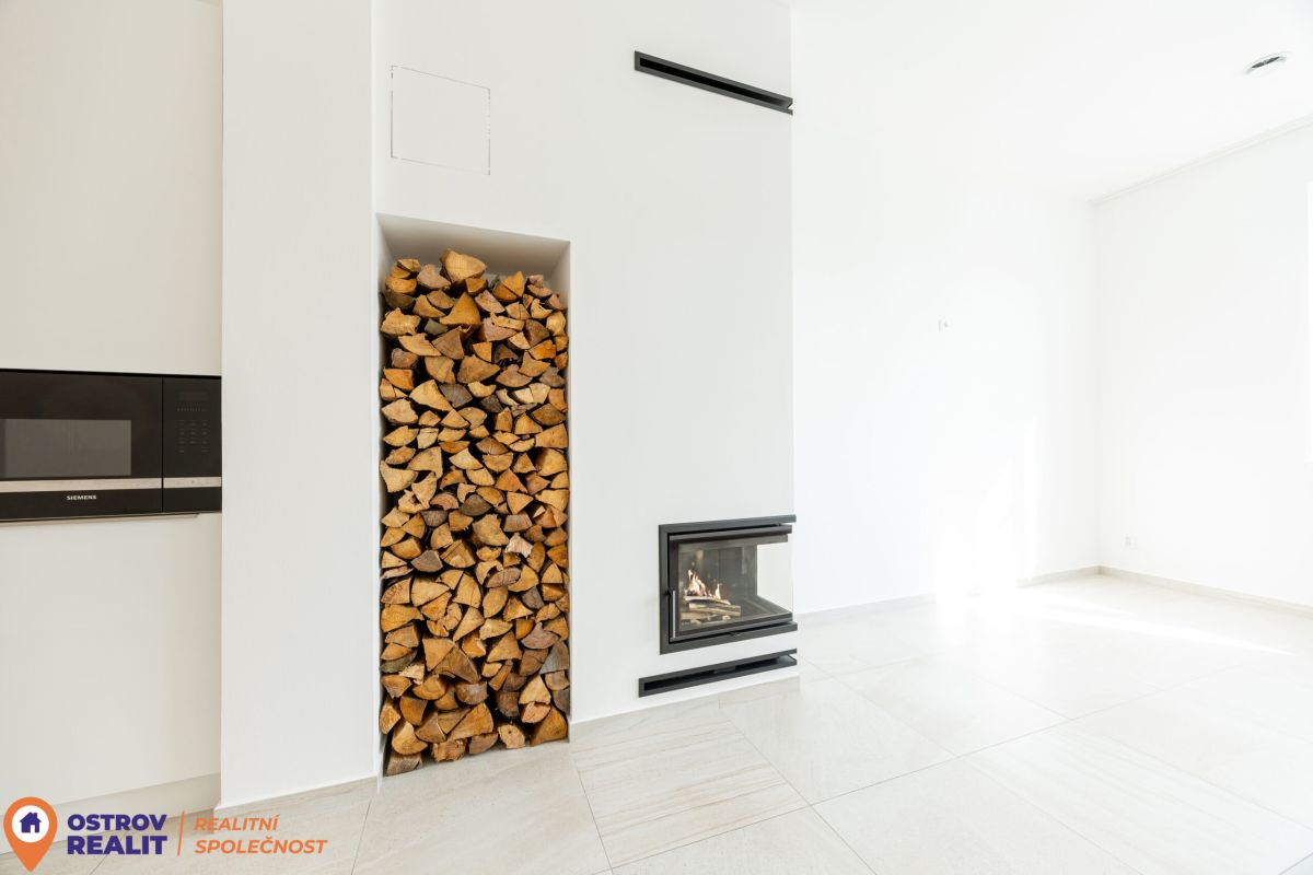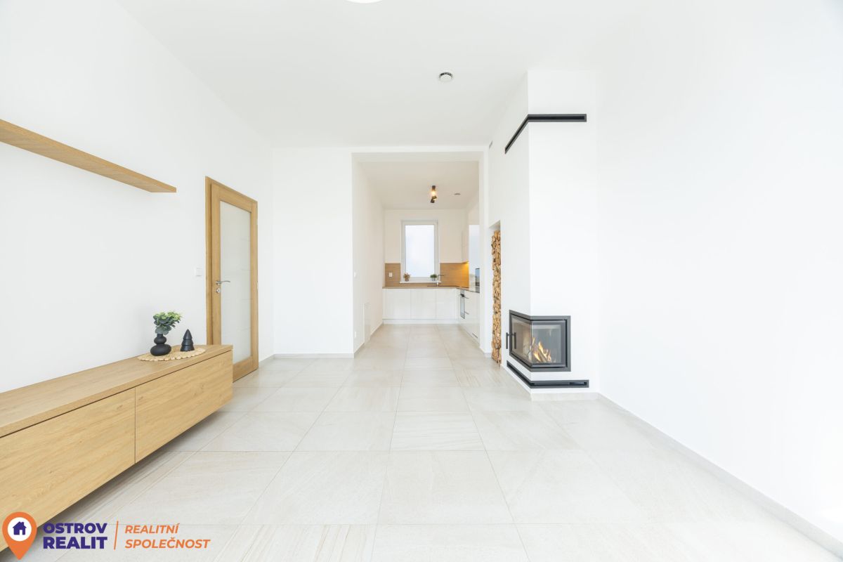 Srdcem bytu je otevřený obytný prostor s kuchyní, který přirozeně vybízí k setkávání s rodinou i přáteli. Dominantou místnosti je krb, jenž dodává interiéru jedinečnou atmosféru, zatímco velkoformátová šedá dlažba podtrhuje čistý, moderní styl. Z chodby se přes designové posuvné dveře vstupuje do útulné ložnice. Byt dále nabízí další velký pokoj, ideální jako dětský pokoj, pracovna nebo pokoj pro hosty.