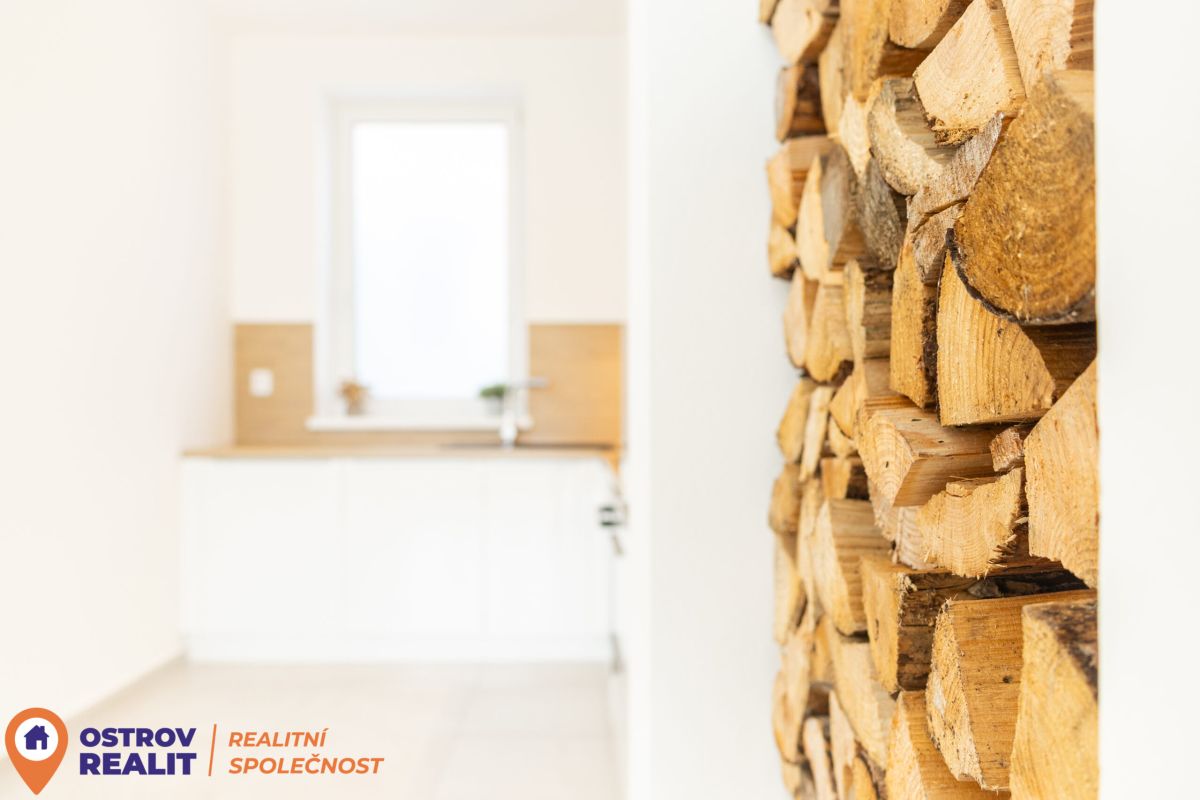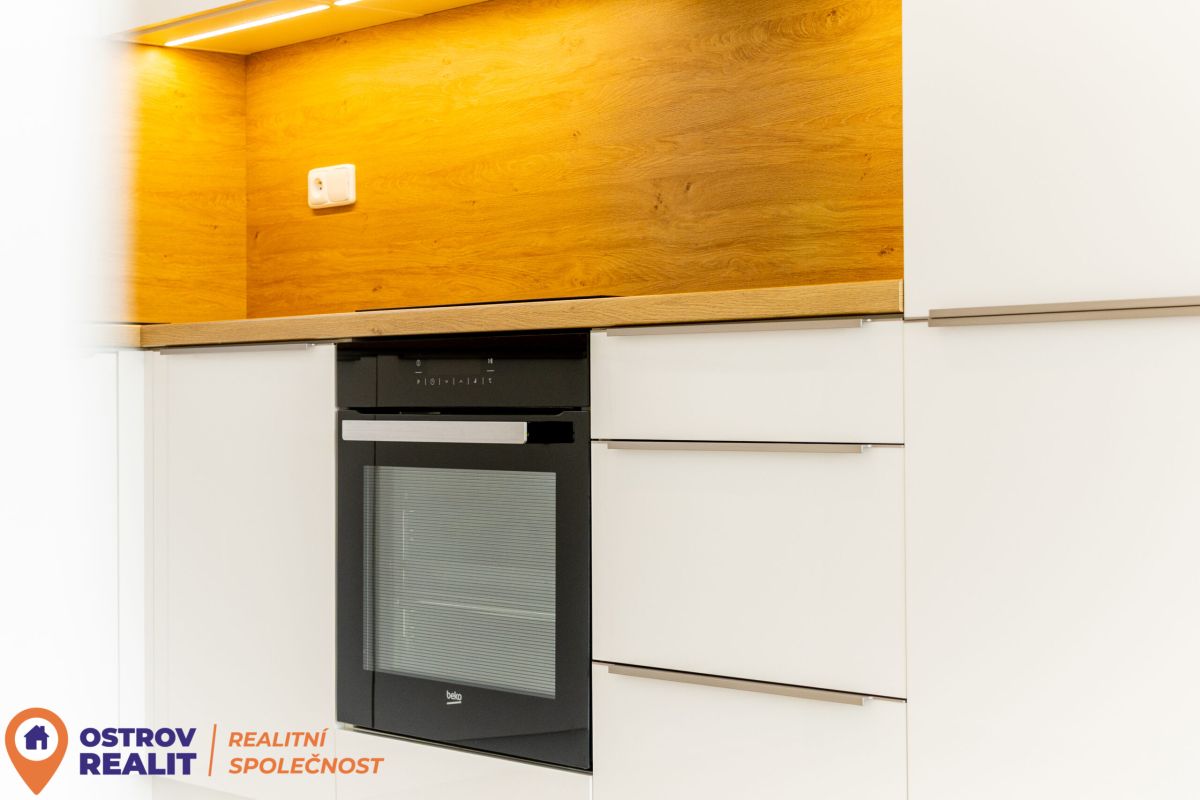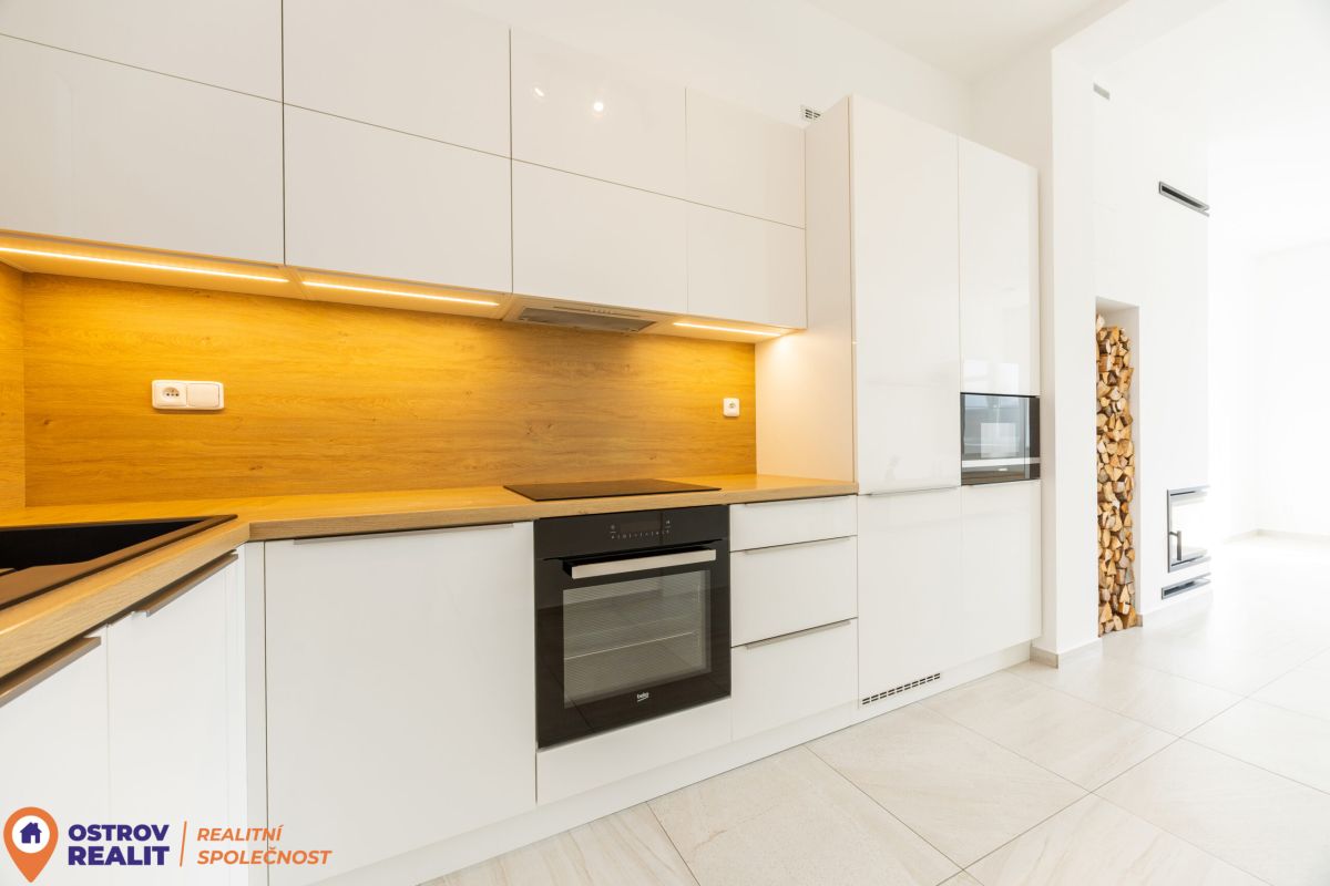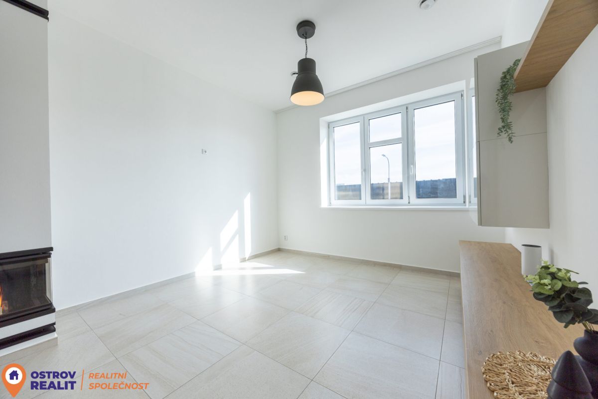 Srdcem bytu je otevřený obytný prostor s kuchyní, který přirozeně vybízí k setkávání s rodinou i přáteli. Dominantou místnosti je krb, jenž dodává interiéru jedinečnou atmosféru, zatímco velkoformátová šedá dlažba podtrhuje čistý, moderní styl. Z chodby se přes designové posuvné dveře vstupuje do útulné ložnice. Byt dále nabízí další velký pokoj, ideální jako dětský pokoj, pracovna nebo pokoj pro hosty.