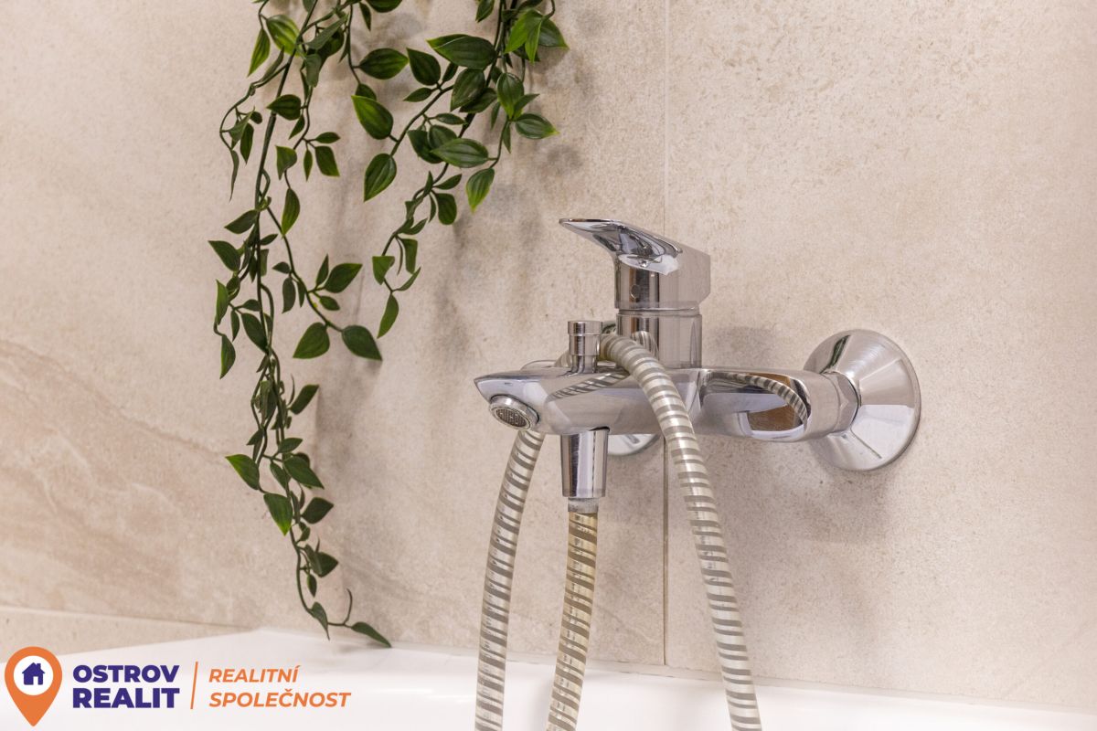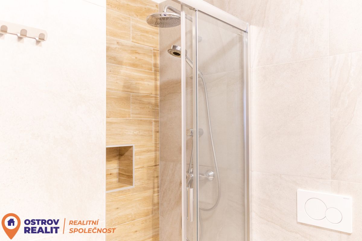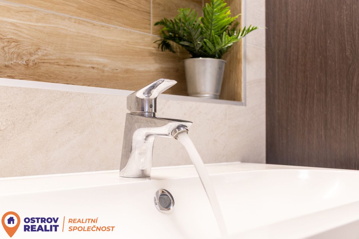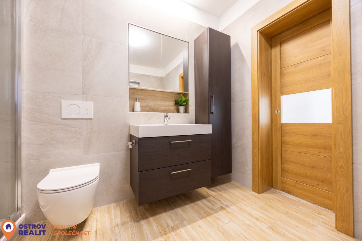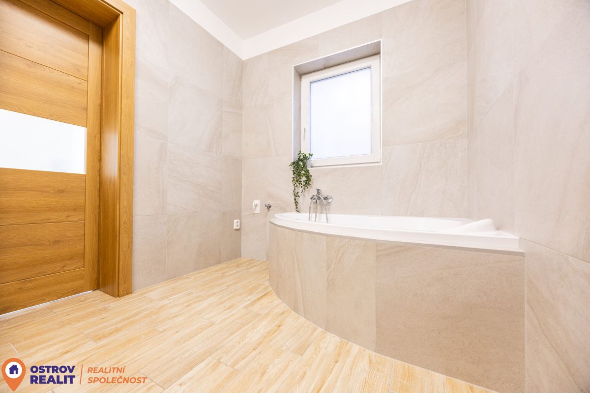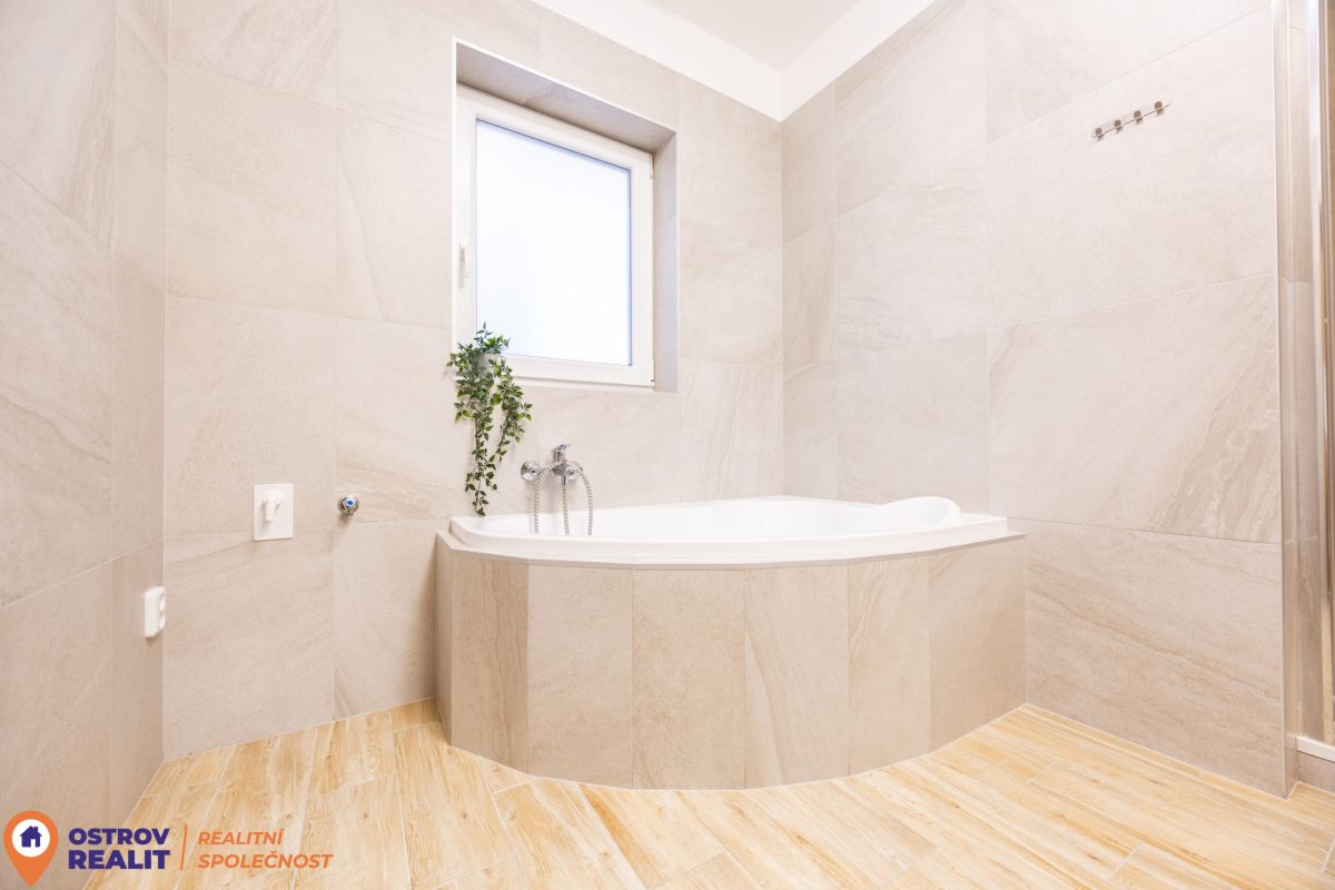 Skutečným komfortem je prostorná, designově řešená koupelna, která nabízí jak rohovou vanu pro chvíle relaxace, tak i praktický sprchový kout. A je zde i místo na pračku a sušičku.
