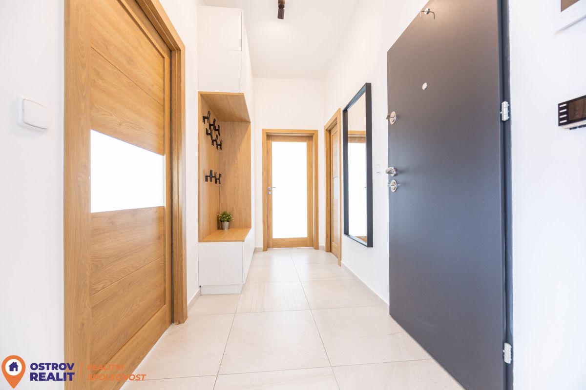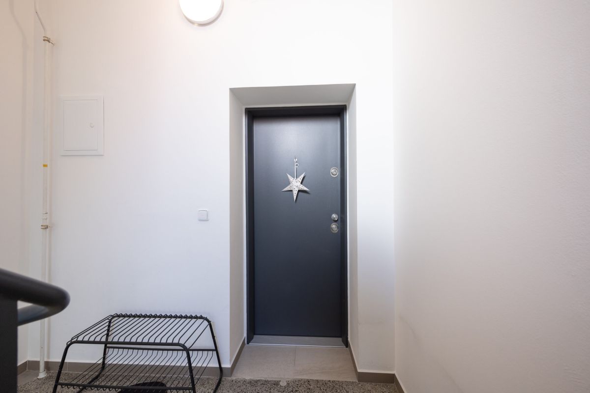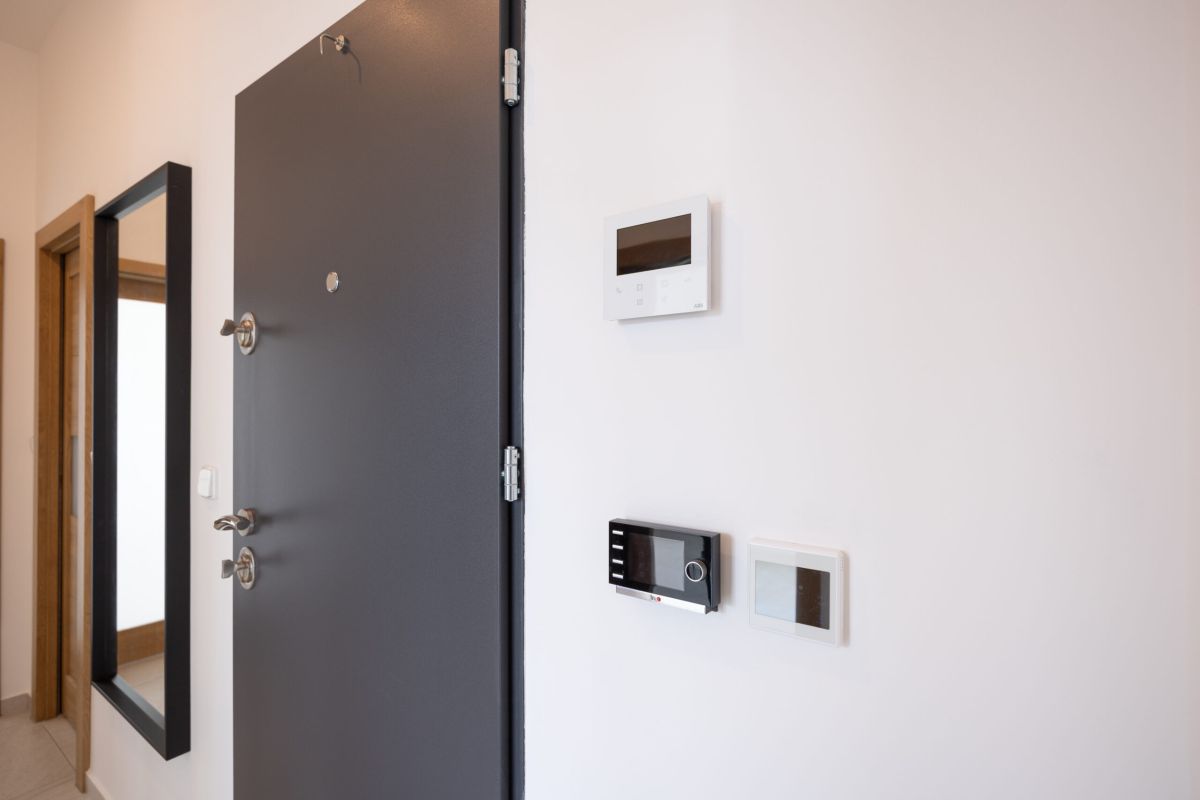 Součástí bytu je moderní domovní videotelefon s možností ovládání přes mobilní telefon. Díky tomu můžete pohodlně otevřít vstupní dveře kurýrovi nebo návštěvě přímo ze svého telefonu, což výrazně zvyšuje komfort každodenního bydlení.