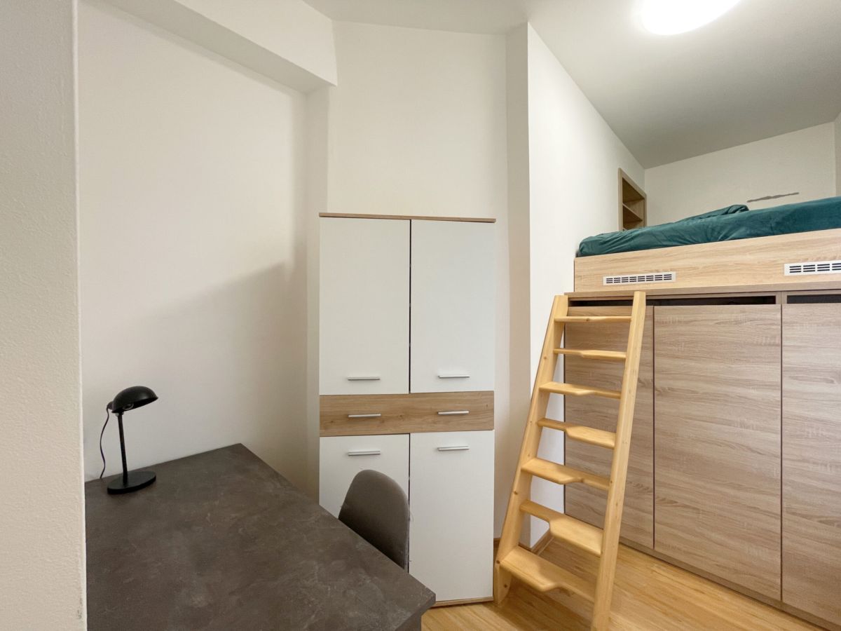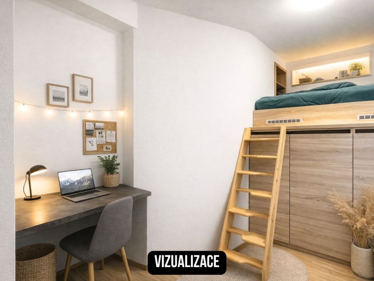 V ložnici je prakticky řešený vyvýšený prostor, ve kterém je umístěná postel, díky čemuž zůstává v pokoji dostatek místa pro vytvoření například útulného koutku na čtení, knihovnu nebo relaxaci.