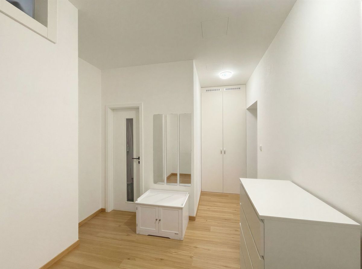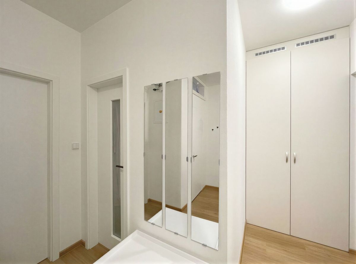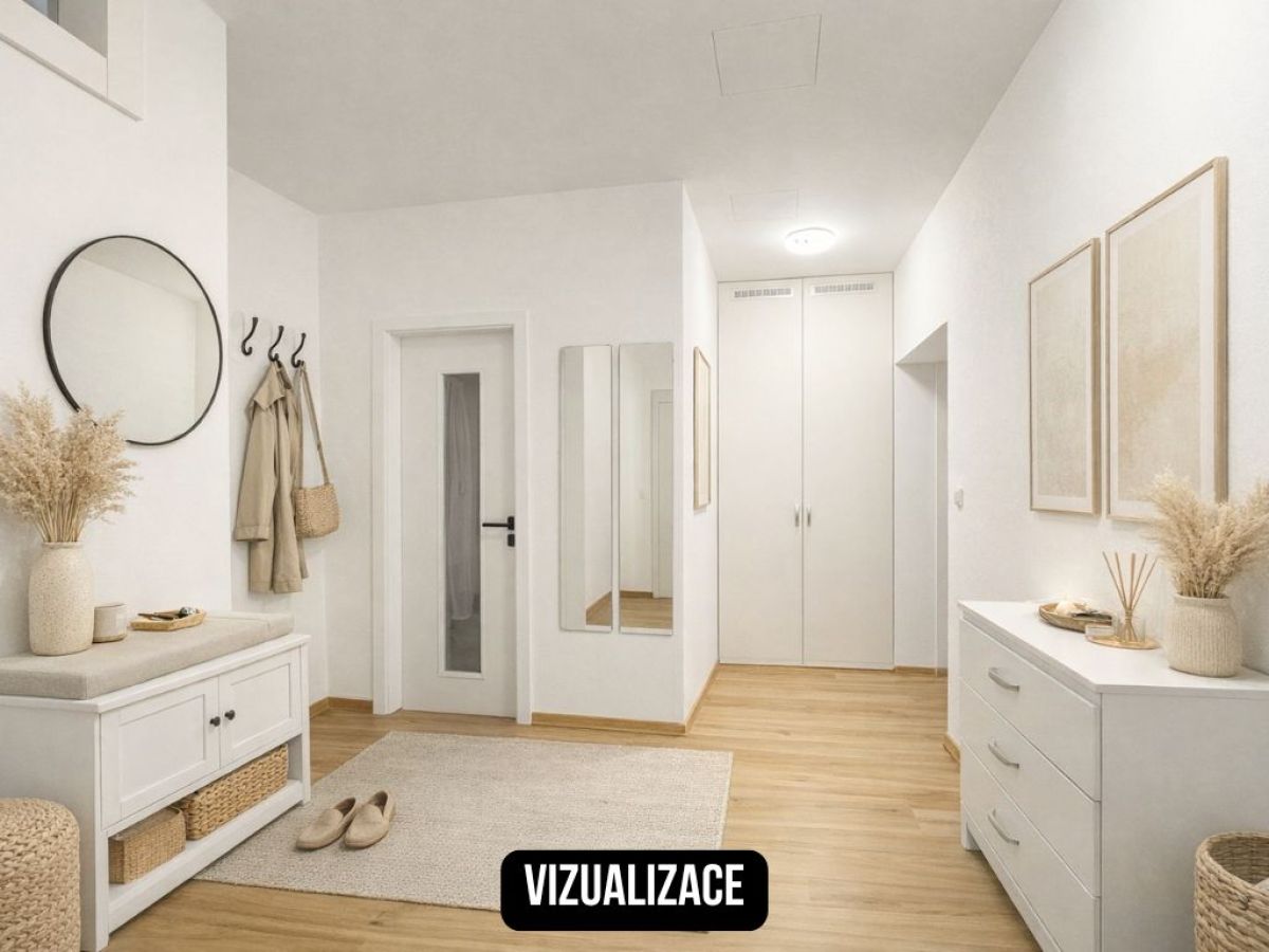 Byt působí velmi příjemně a prakticky – už při vstupu vás překvapí prostorná chodba s vestavěnou skříní, kam bez problémů schováte nejen pračku a všechny „nezbytnosti“, které nechcete mít na očích. Je zde také chytře ukrytý plynový kotel.