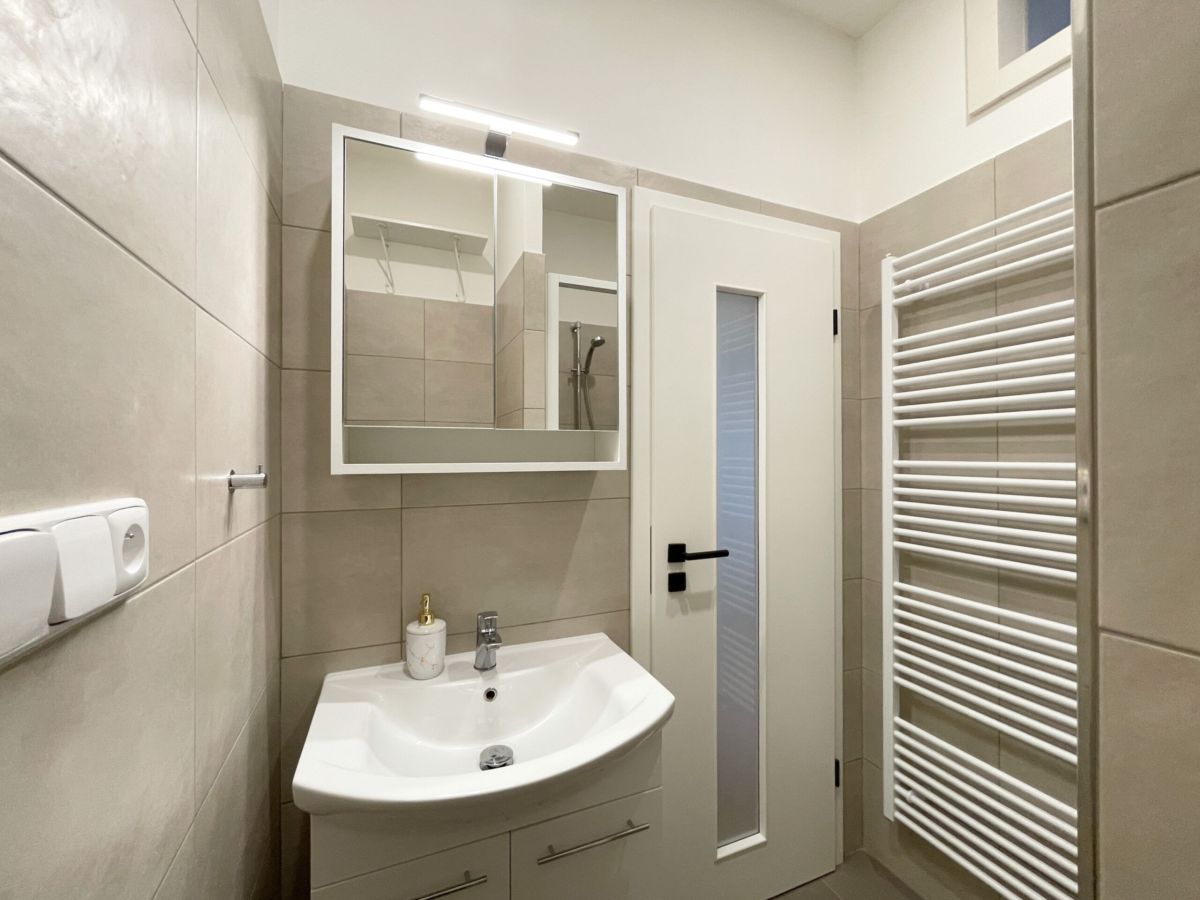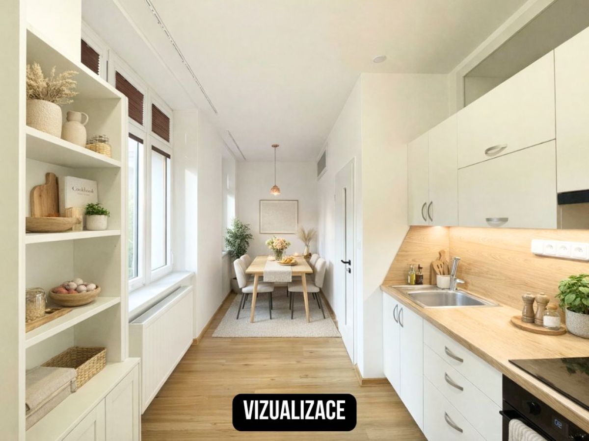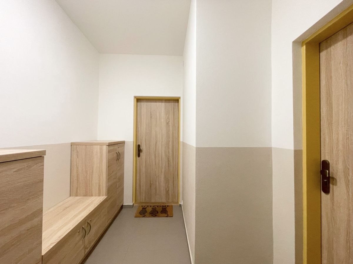 Byt působí velmi příjemně a prakticky – už při vstupu vás překvapí prostorná chodba s vestavěnou skříní, kam bez problémů schováte nejen pračku a všechny „nezbytnosti“, které nechcete mít na očích. Je zde také chytře ukrytý plynový kotel.