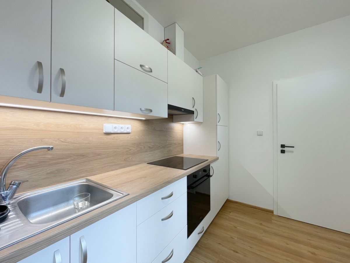 Kuchyně je řešená jako podlouhlý prostor, který přirozeně rozděluje místo pro vaření a jídelní část. Díky tomu nepůsobí stísněně a nabízí dostatek prostoru pro každodenní fungování. Kuchyňská linka je vybavena spotřebiči – nechybí trouba, indukční varná deska, digestoř ani vestavěná lednice s mrazákem.