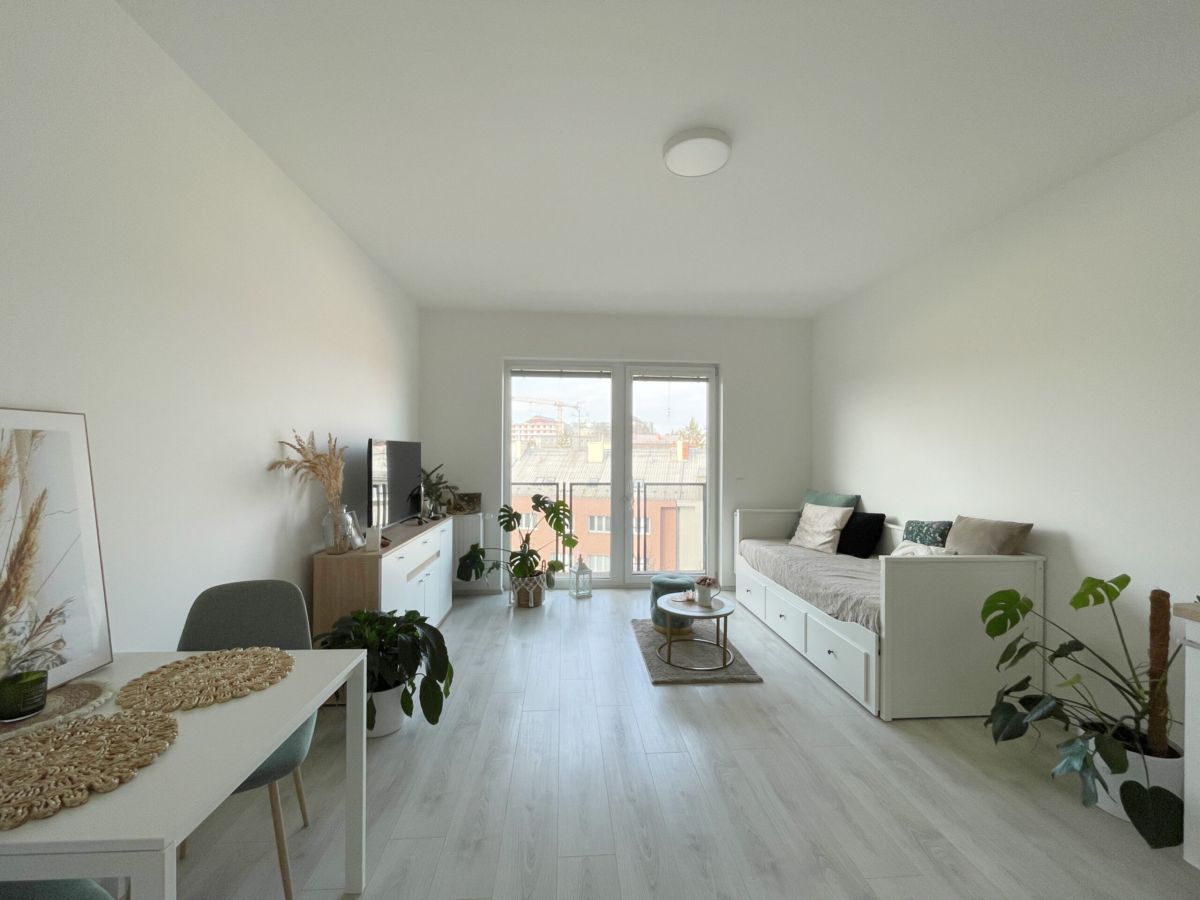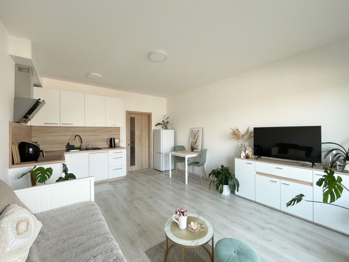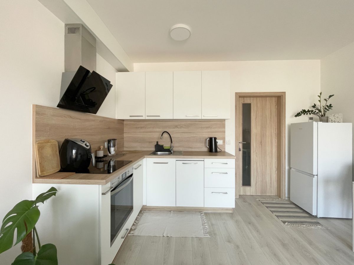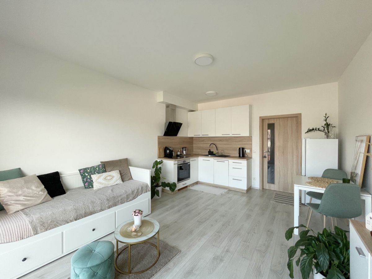 Dominantou bytu je elegantní kuchyňská linka vybavená troubou, varnou deskou, myčkou nádobí, digestoří a lednicí. Obytný prostor působí vzdušně a nabízí dostatek místa pro pohodlné bydlení jedné osoby.