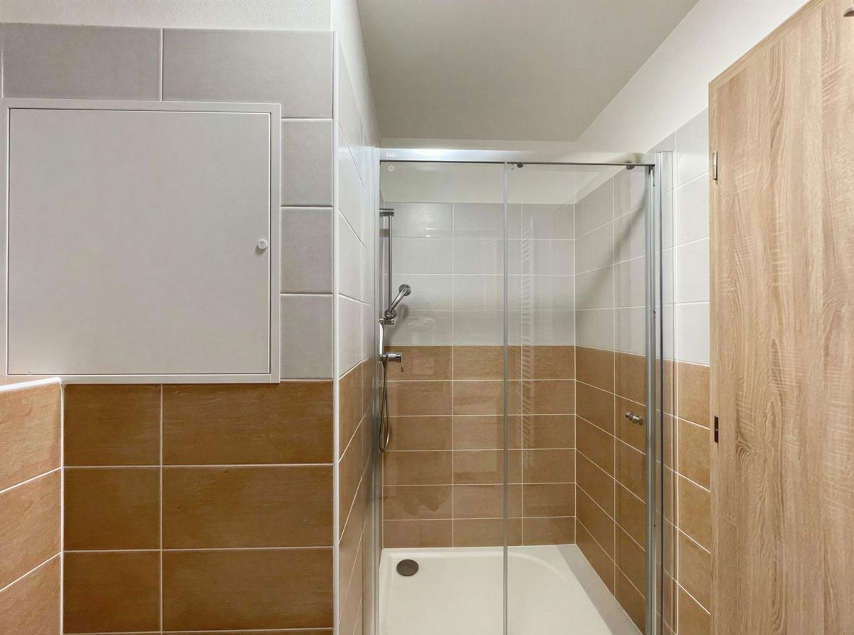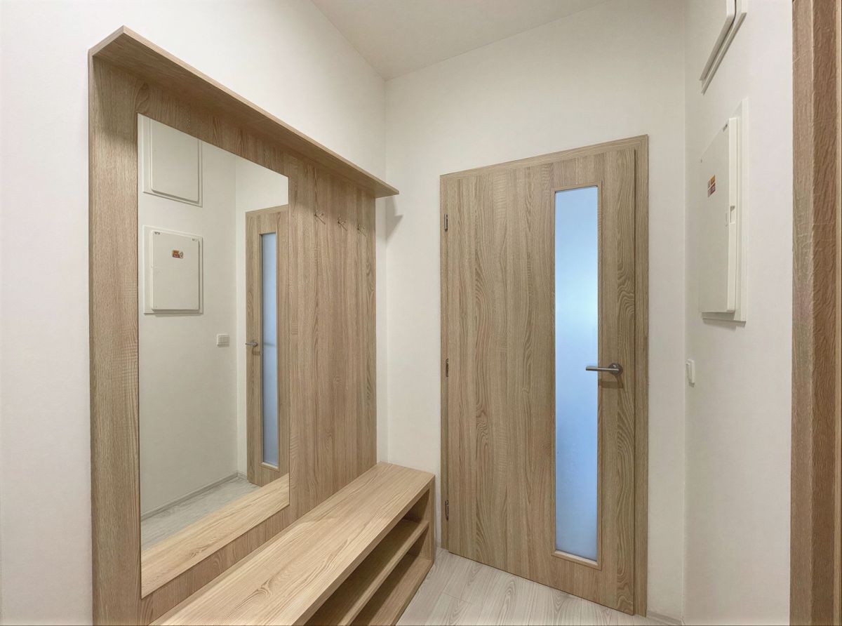 Velkou výhodou je chytře řešená vstupní chodba s vestavěnou skříní vyrobenou na míru až ke stropu, která poskytuje nadstandardní úložný prostor. Součástí je také praktický botník s věšáky a zrcadlem. Koupelna je moderně zařízená a disponuje sprchovým koutem, umyvadlem se skříňkou, toaletou a připraveným místem pro pračku.